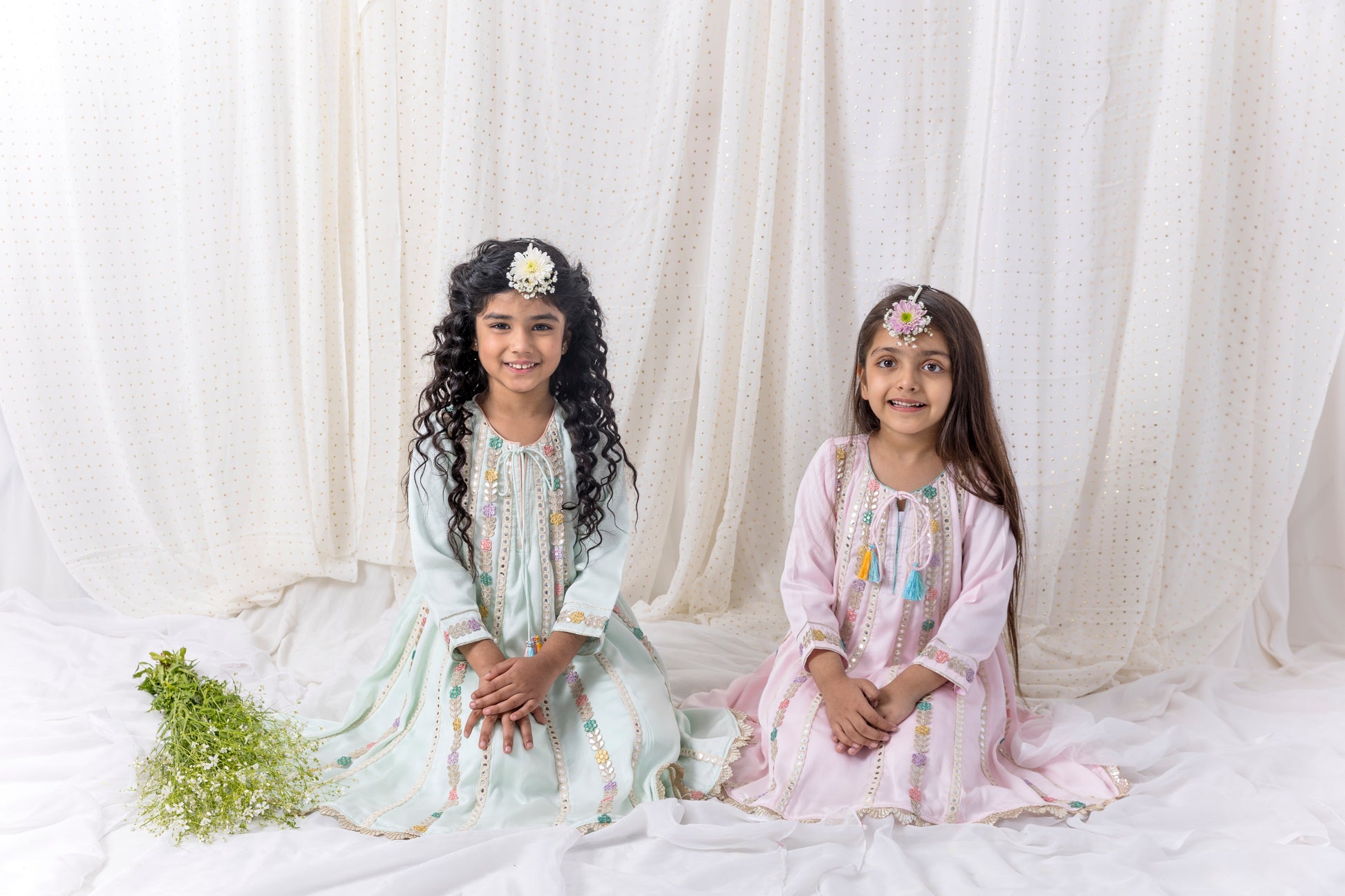 • Muslin top in powder blue with mirror work and gota patti lace and matching pants.