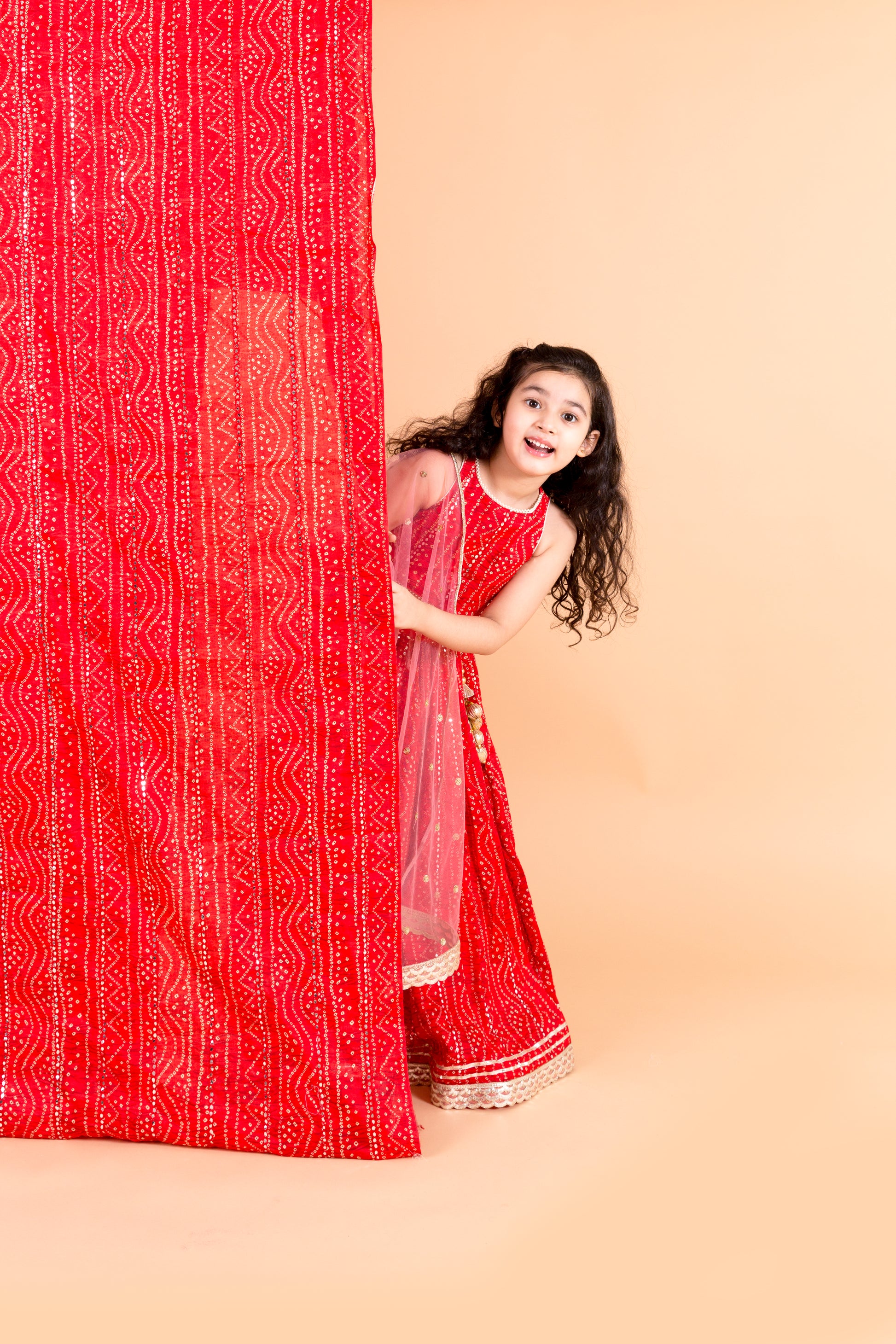 Red color bandhni print top and lehnga with contrast net Dupatta.