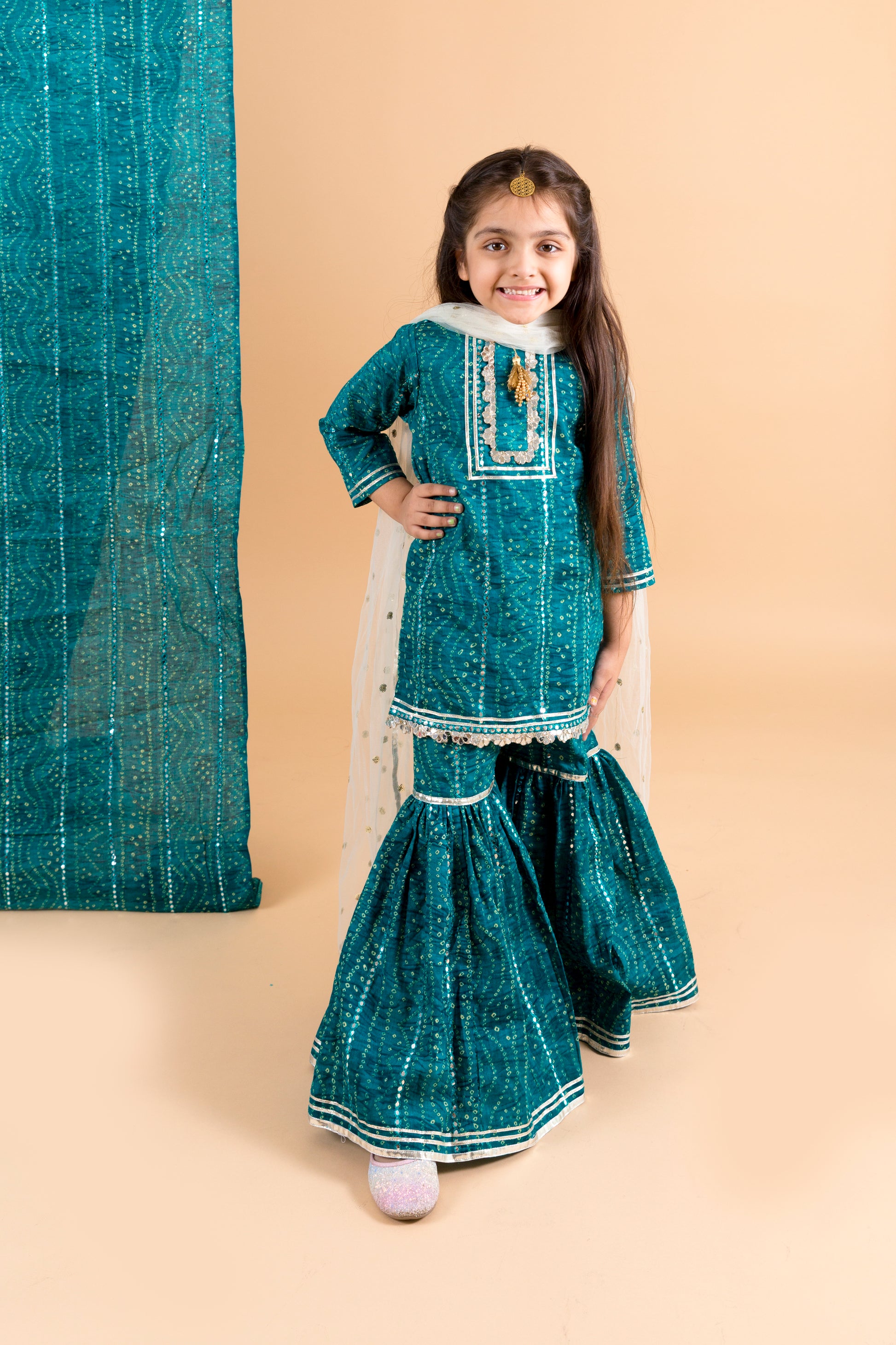 Short kurta with matching sharara and contrast dupatta